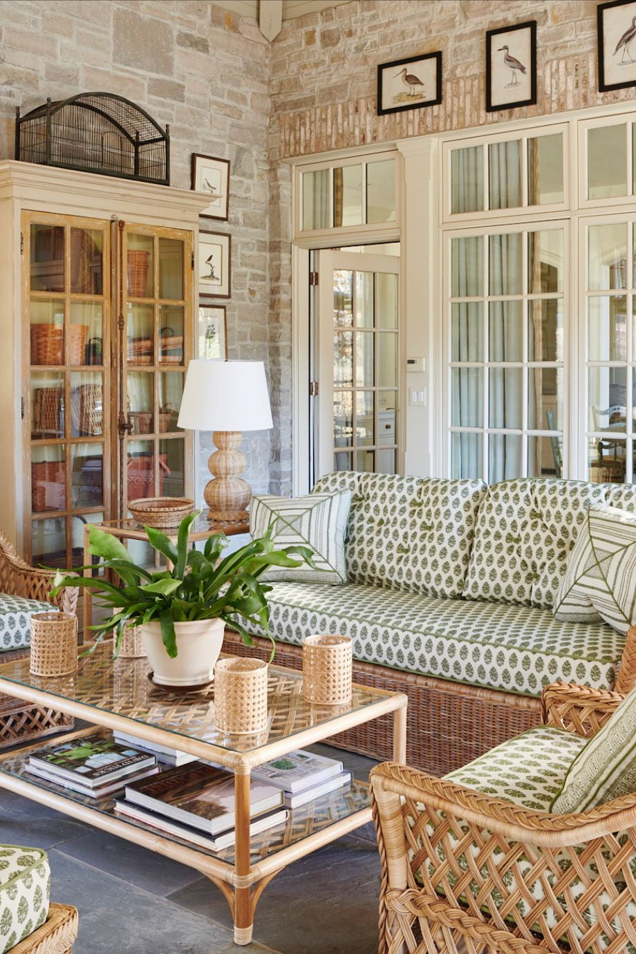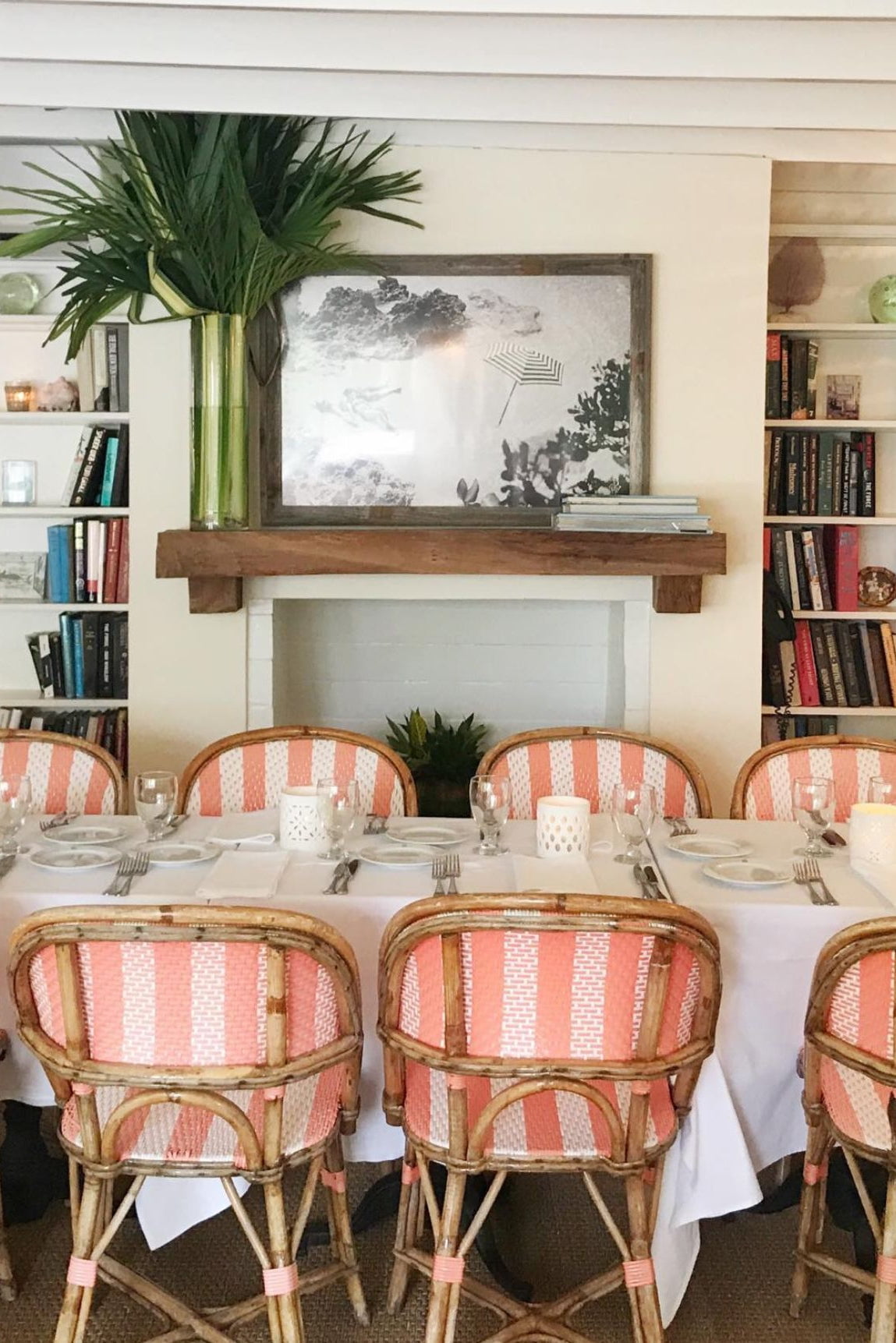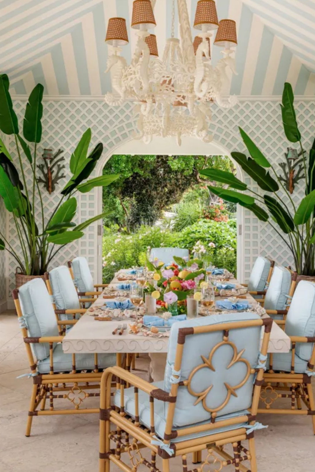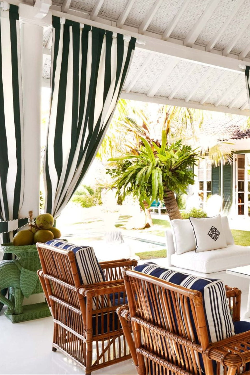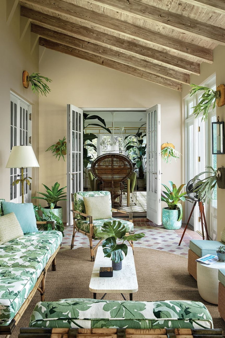 Vintage Palm Beach is a vibrant, eclectic style characterized by bold colors like hot pink, turquoise, and lime green, mixed with natural, tropical elements such as rattan, bamboo, and palm prints. It combines preppy and maximalist aesthetics with a touch of Hollywood Regency glamour, incorporating natural textures, whimsical motifs, and vintage-inspired pieces to create a sophisticated yet fun atmosphere